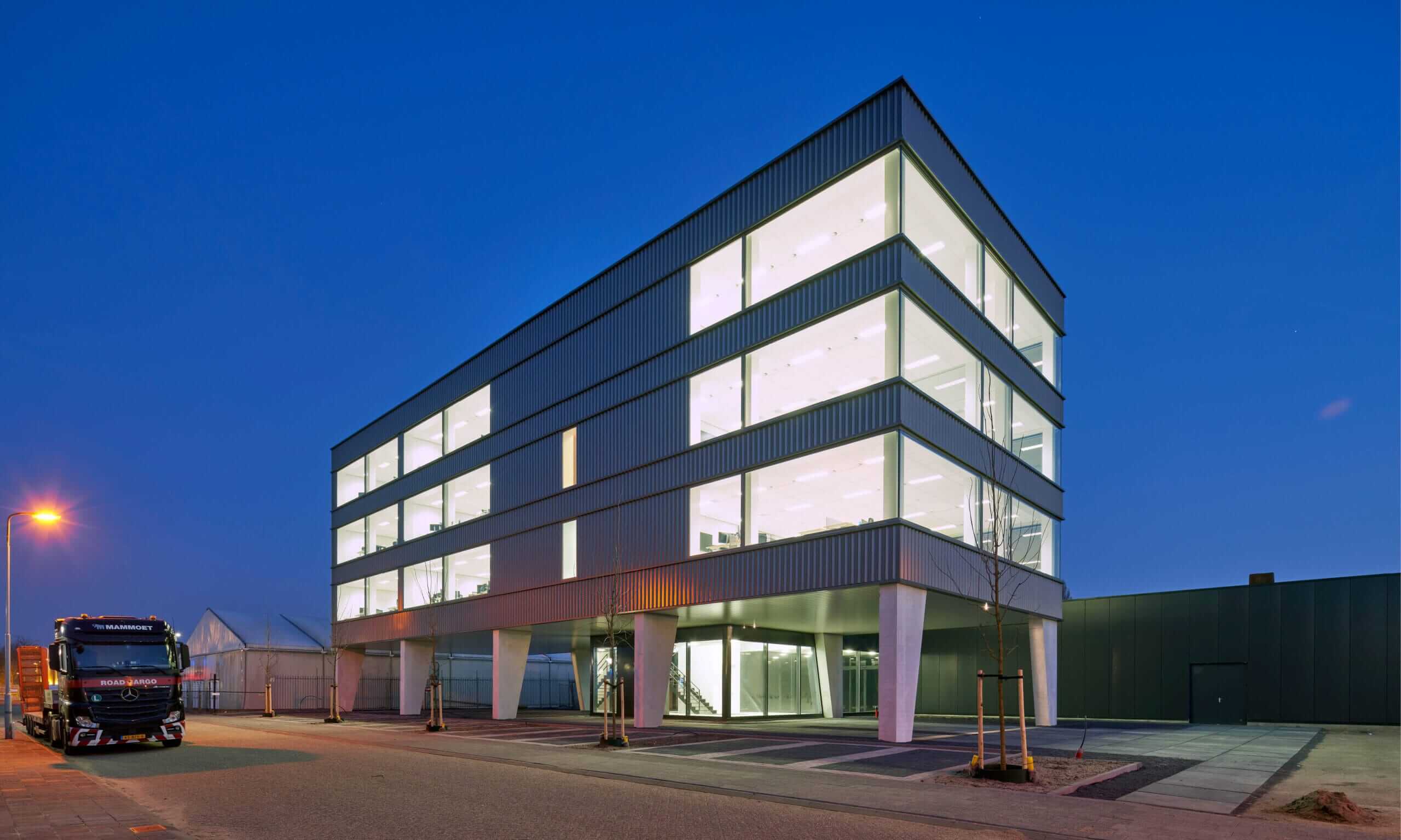 Voor het ontwerp van de nieuwbouw waren een aantal factoren richtinggevend. Primair was dit de behoefte aan een licht, transparant en open kantoorgebouw met een optimaal werkklimaat. Zo gaven we bewust de kantoorvertrekken, gangen, algemene ruimten en raamvlakken ruim vorm. Door het bouwvolume van 3 verdiepingen op te tillen en te plaatsen op 10 prominent vormgegeven betonnen kolommen, ontstond een open maaiveld met ruimte voor een bijzondere tuininrichting en een representatief voorplein naar de nieuwe hoofdentree.