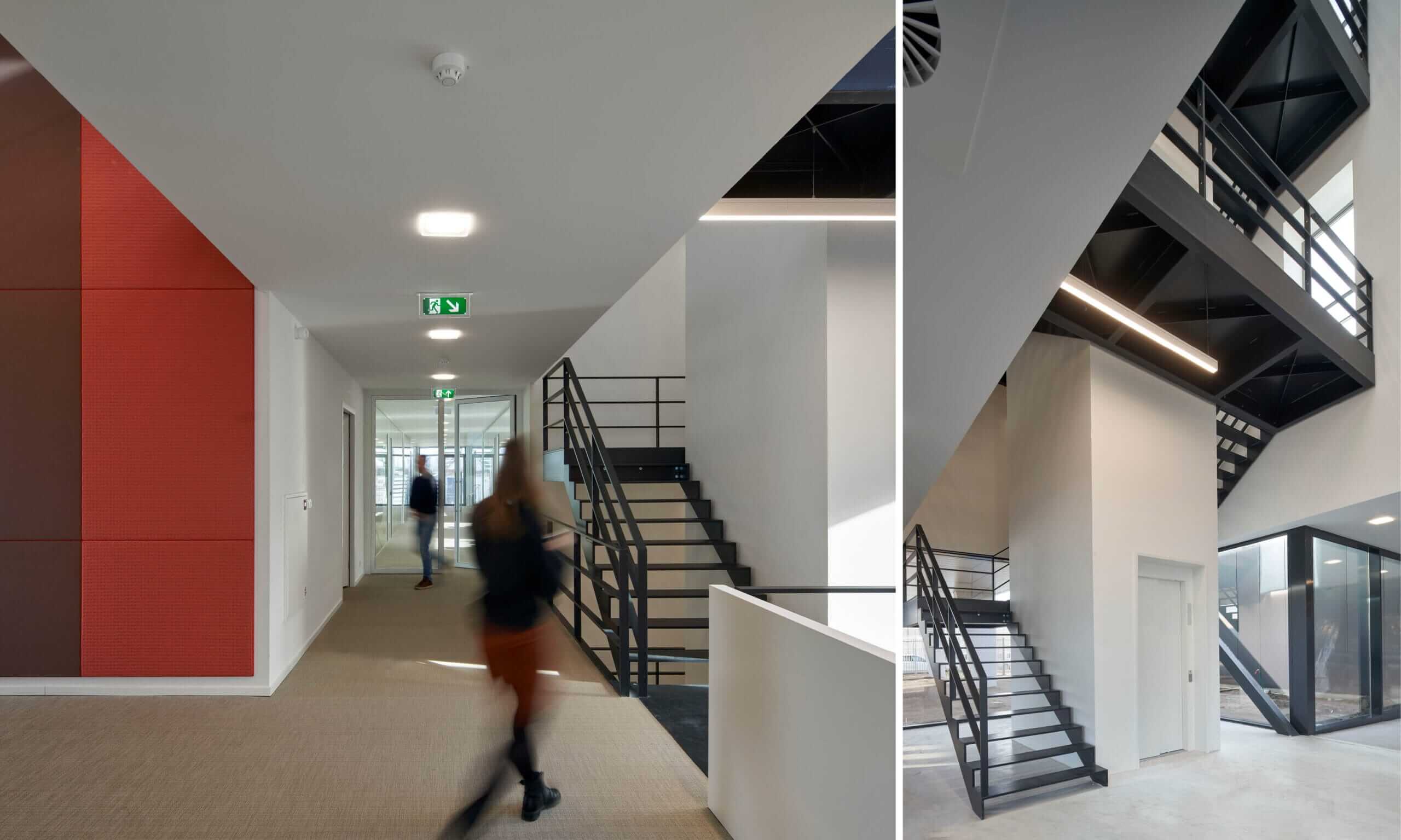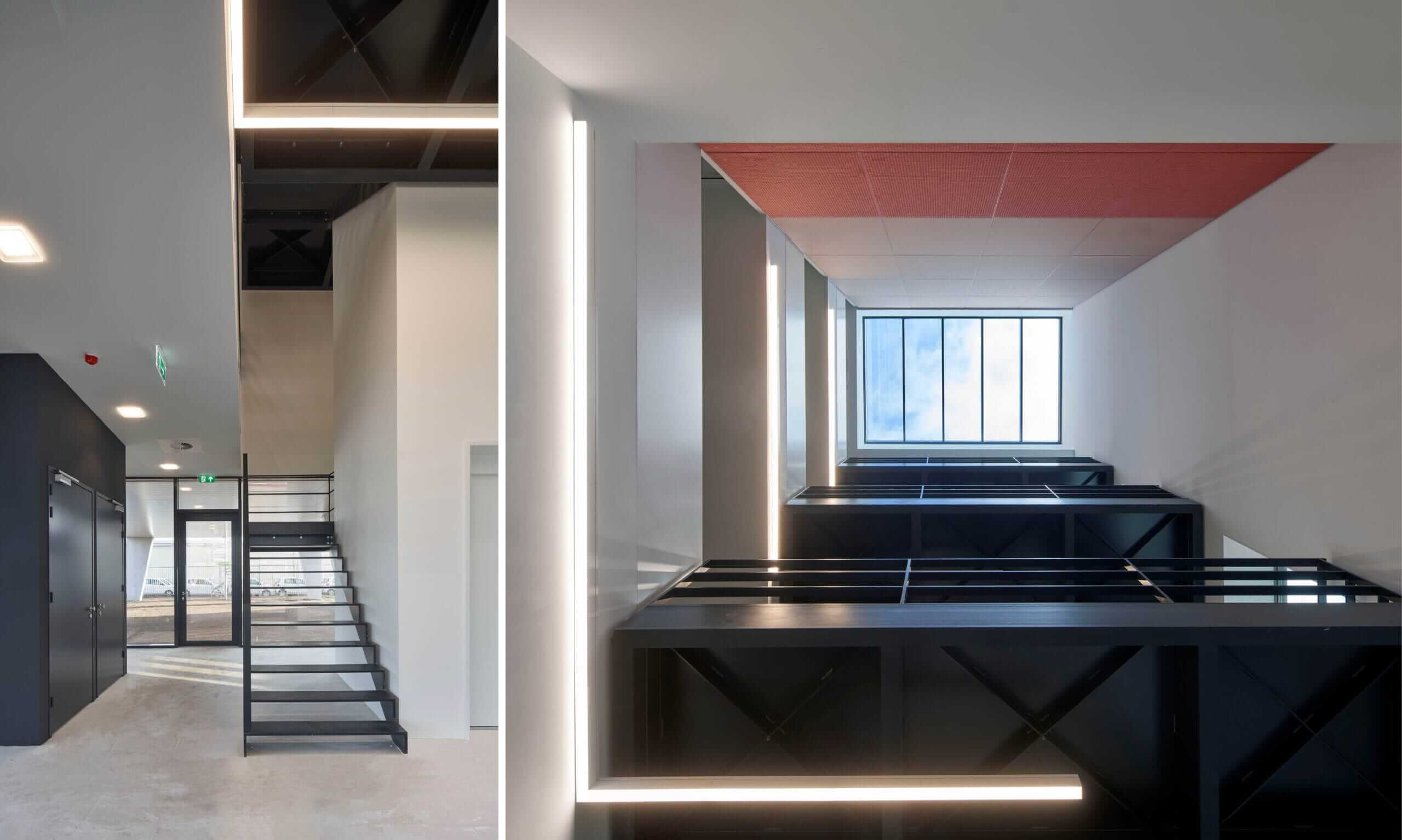 Centraal in het gebouw ligt een ruime, representatieve vide die de verschillende bouwlagen met elkaar verbindt. Met als blikvanger de robuuste stalen hoofdtrap met bordessen, die zich rond de liftschacht naar boven beweegt. De nieuwbouw is op de begane grond door een glazen verbindingsgang met het naastgelegen, bestaande pand verbonden. In de architectuur van de gevels kozen wij voor een horizontale geleding van de bouwmassa met zetwerkbanden, die de hoogte van de bandvensters accentueren. De dichte gevel hebben we voorzien van een driehoekig gezette, metalen gevelplaat. Door de vormgeving van deze plaat en de keuze voor een reflecterende, bronsgrijze coating verandert het gebouw met de zoninval gedurende de dag van uiterlijk.