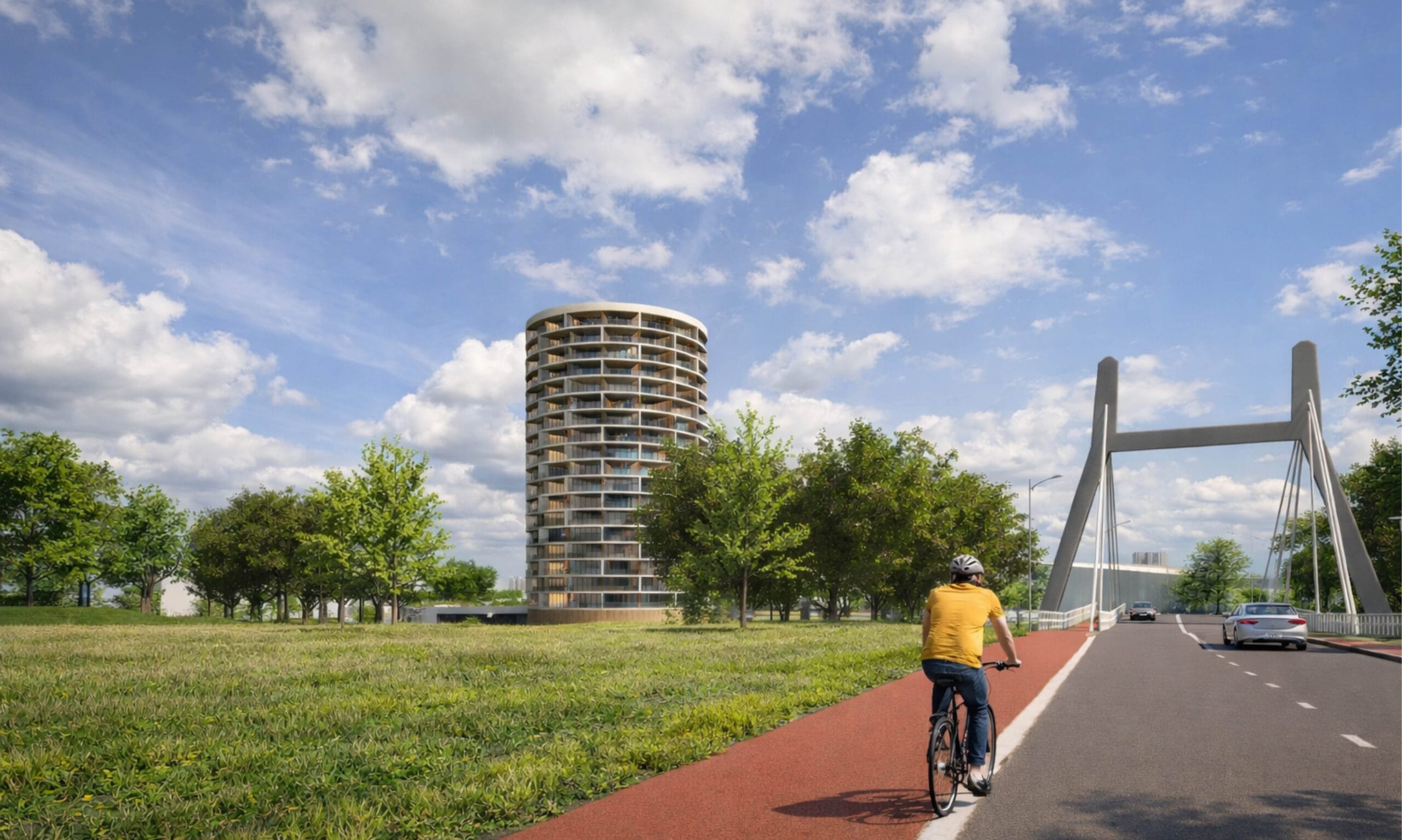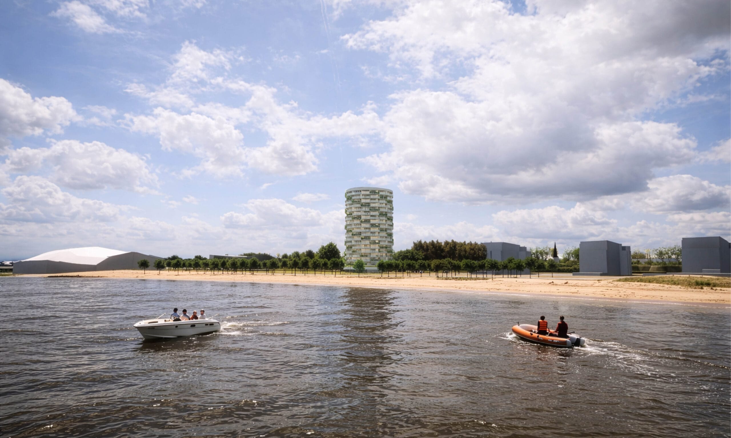 Aan de oevers van de Schelde in Bergen op Zoom landt een ontwerp waarin wonen en recreatie samenkomen. De toren markeert de waterkant, met uitzichten over het water en de omliggende regio.