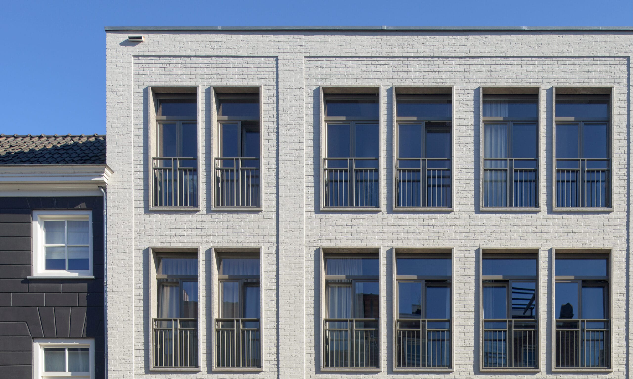 De klassieke verhouding tussen plint en bovenbouw hebben we versterkt door een plint van natuursteen (Muschelkalk) en de bovengelegen verdiepingen van warm witgrijs gekeimd metselwerk te voorzien. Het grote gevelvlak verkleinden we verder door de maat van de natuurstenen penanten uit de plint door te trekken in de vorm van metselwerk-kaders in de bovengelegen verdiepingen. Door de compositie met metselwerk in wisselende diepte ontstaat een eigentijdse ornamentiek die het gebouw een eigen karakter geeft.