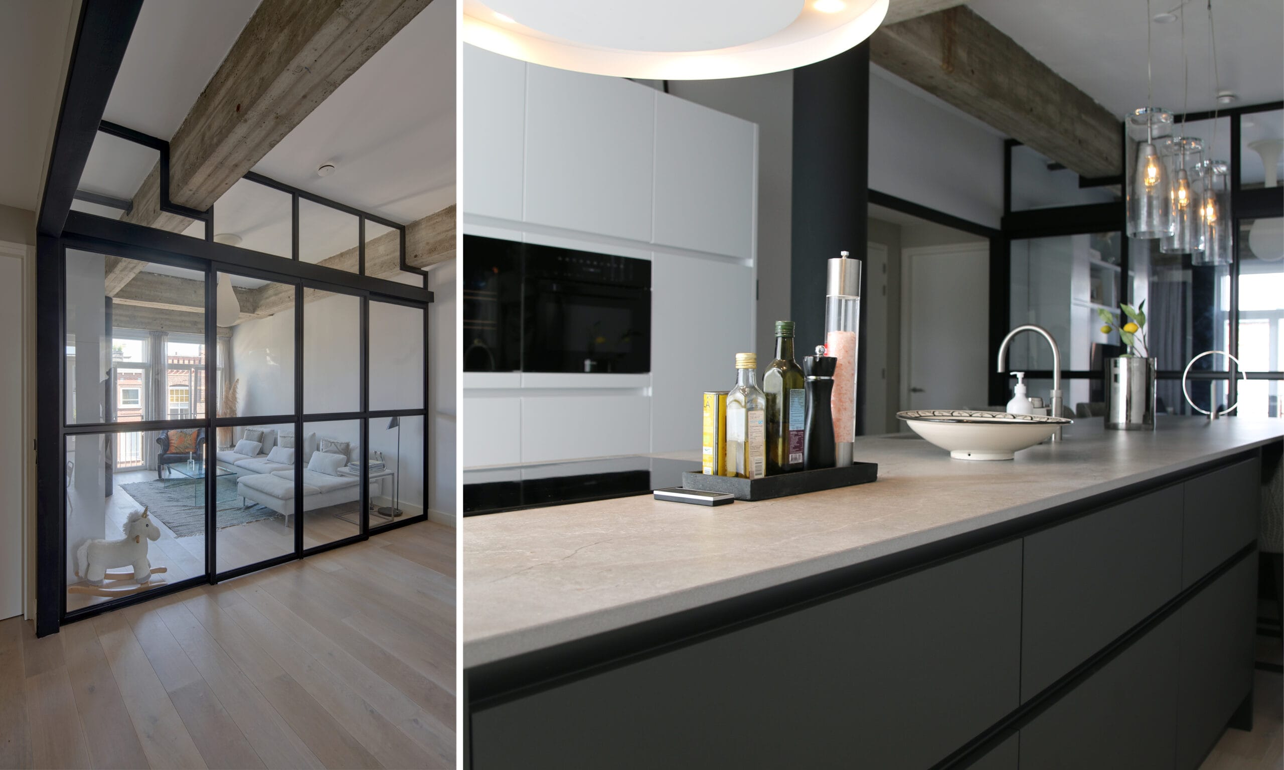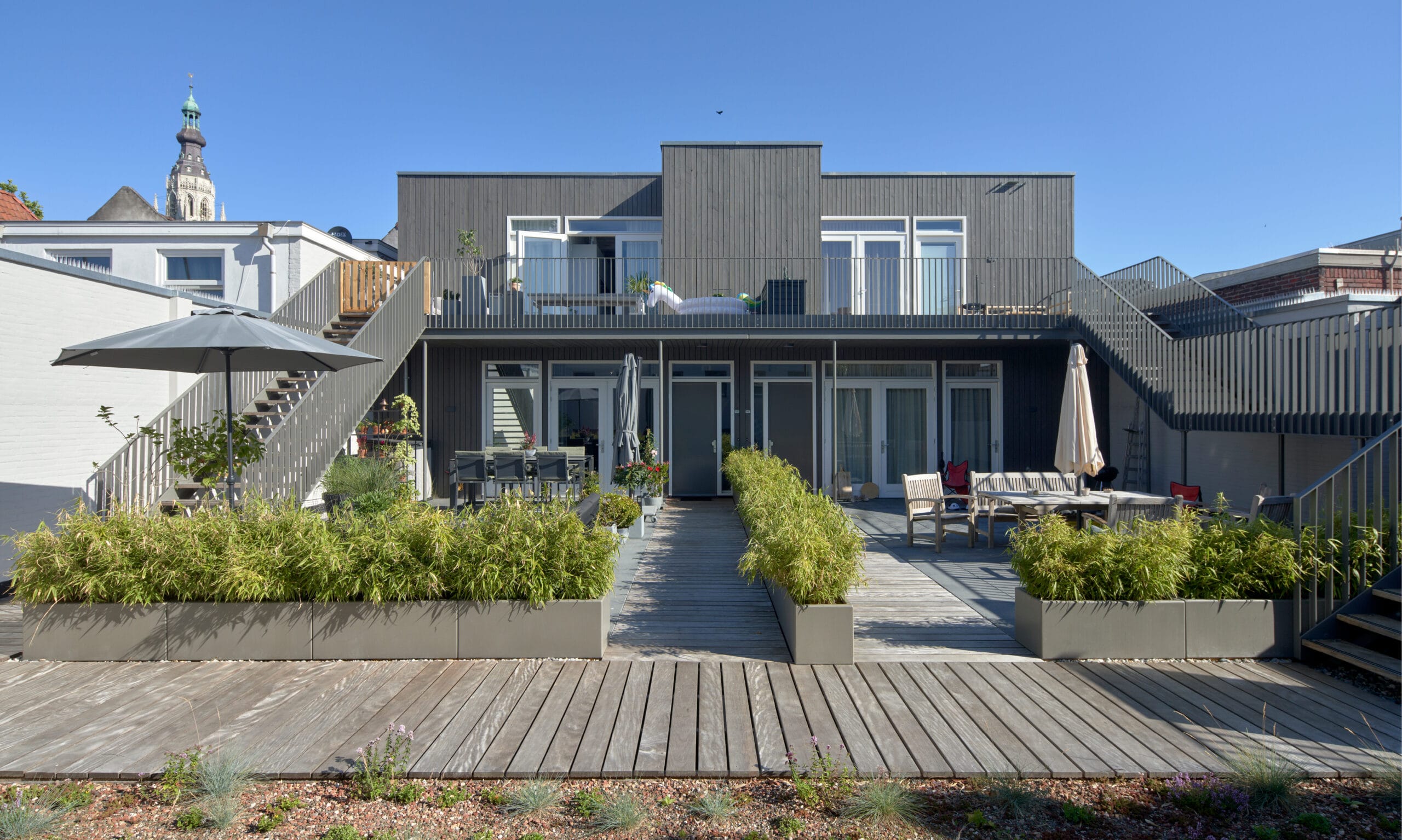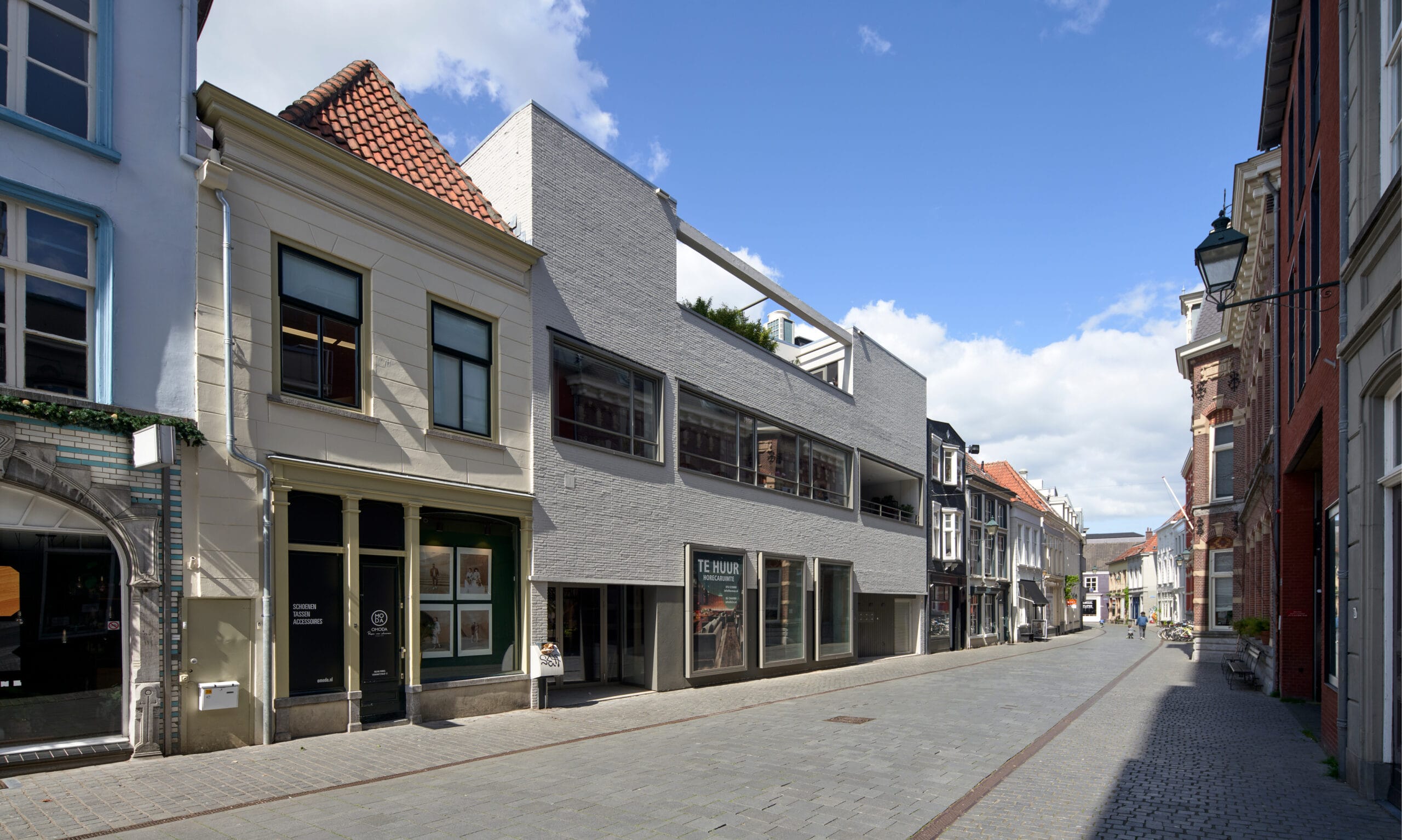 De grote puien van de oude winkelfunctie hebben voor de nieuwe horeca een meer besloten en kleinschalige uitstraling gekregen. Een ruime vide verbindt de begane grond visueel met het horeca-programma in de kelder. Teruggrijpend naar de oorspronkelijke structuur van het bankgebouw hebben we tussen de woningen een binnentuin op het dak gerealiseerd. Zo past de bouwmassa beter in het fijnmazige historische bouwblok en ontstaat voor de bewoners een aangename daktuin met prachtig uitzicht. De binnentuin heeft een gevel van natuurlijk, verduurzaamd hout en een sedum dak.